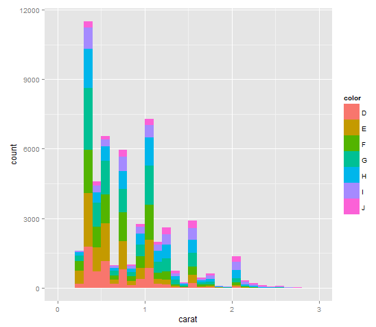 > qplot(carat,data=diamonds,geom="histogram",binwidth=.1,xlim=c(0,3),fill=color)