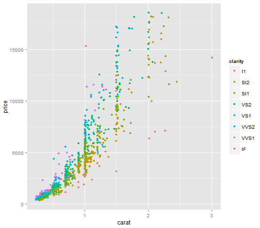 >p=ggplot(data=sample,mapping=aes(x=carat,y=price,color=clarity))#定义的第一图层存储于p中