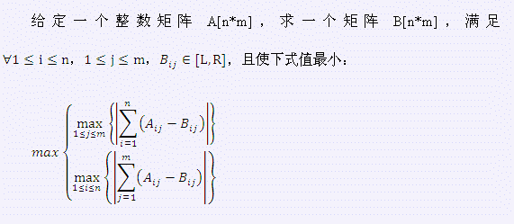 http://www.lydsy.com/JudgeOnline/problem.php?id=2406 设矩阵C=A-B 最小化 C 一行或一列和的最大值 整体考虑一行或者一列的和 二分最大值 这样 ...