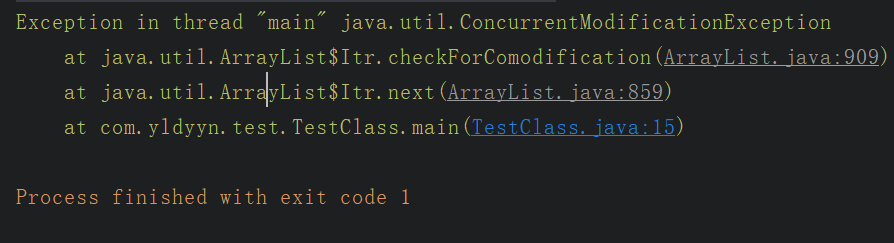 这个关键的地方来了,remove方法对modCount进行了修改,这个时候expectedModCount和modCount是不一致的,这时候就会出现图中出现的那个异常了。 ConcurrentModificationException异常,而这个异常就是出自ArrayList中的内部类Itr中的checkForComodification方法。