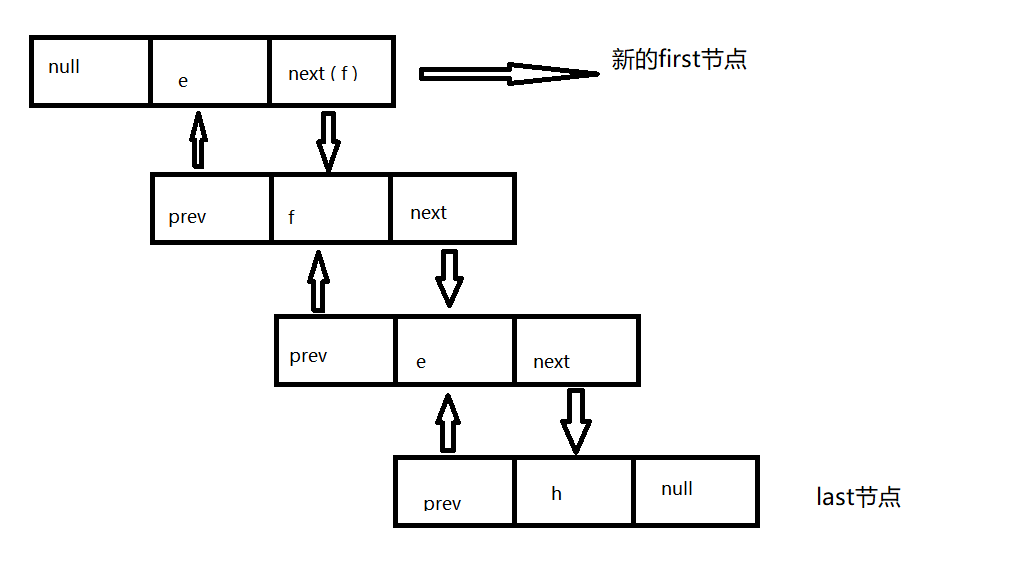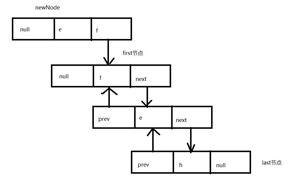 1.拿到first节点设置为f;2.新创建一个newNode设置为next节点为f节点;3.然后把newNode赋值给这个first4.如果f为空,则说明列表中没有元素,last指向newNode,否则,前first的前驱指向newNode;