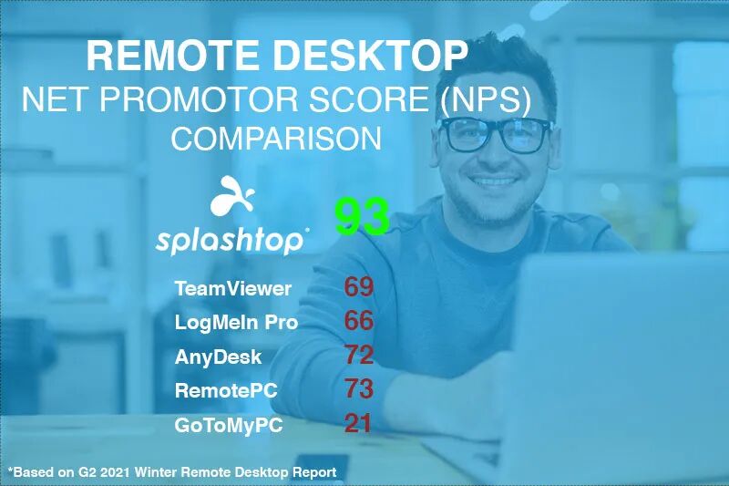 在 G2 的 2021 年冬季远程桌面网格报告中,Splashtop 的净发起人得分(NPS)为 93,是所有远程桌面工具中最高的。