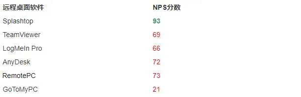 Splashtop Business Access 在远程桌面解决方案中获得了最高的 NPS 评分,得分为93。NPS 是一项客户满意度度量,用于衡量用户将产品推荐给他人的可能性。