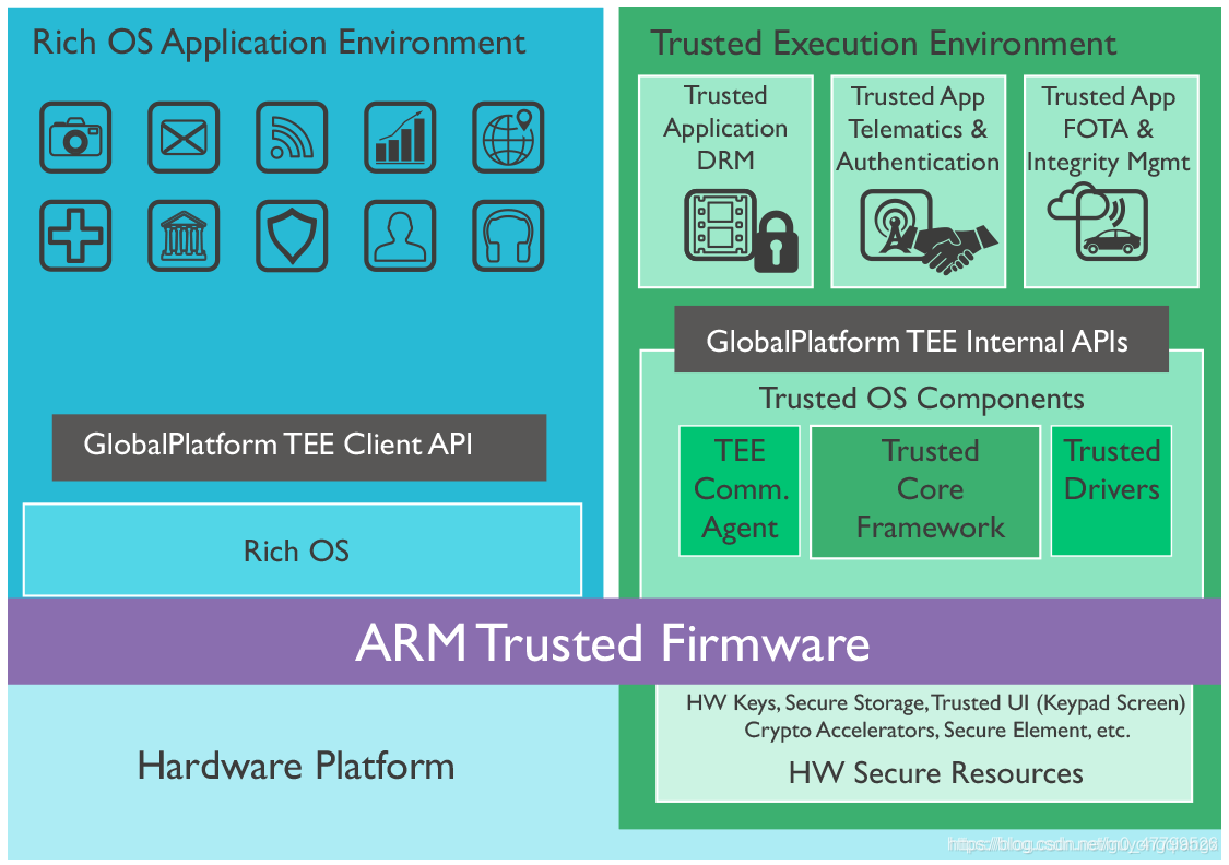 图中左边蓝色部分Rich OS Application Environment(REE)表示用户操作环境,可以运行各种应用,例如电视或手机的用户操作系统,图中右边绿色部分Trusted Execution Envrionment(TEE)表示系统的安全环境,运行Trusted OS,在此基础上执行可信任应用,包括身份验证、授权管理、DRM认证等,这部分隐藏在用户界面背后,独立于用户操作环境,为用户操作环境提供安全服务。