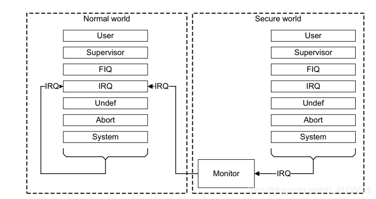 - 当处理器运行在非安全世界时,IRQ直接进入非安全世界的处理函数;如果处理器运行在安全世界,当IRQ发生时,会先进入到Monitor模式,然后跳到非安全世界的IRQ处理函数执行