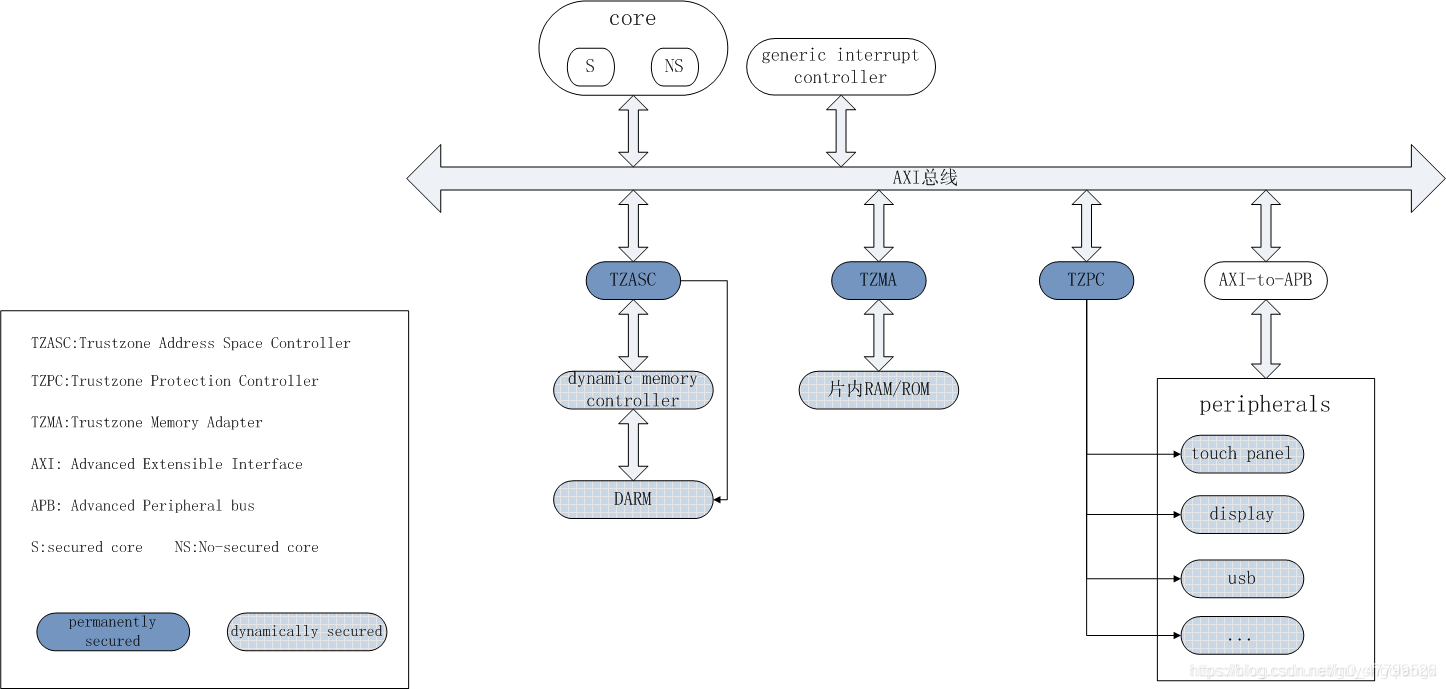 此图来源于网上,实际上TZPC还连接到片内的ROM/RAM设备上,用于配置片上存储的安全区域。