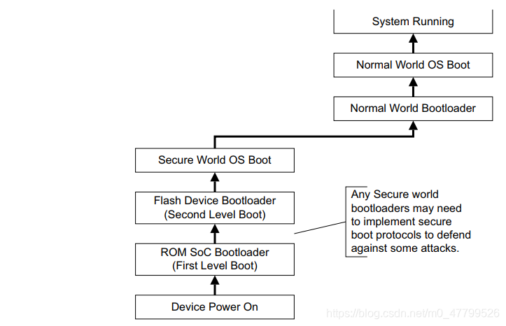 系统上电复位后,先从安全世界开始执行。安全世界会对非安全世界的bootloader进行验证,确保非安全世界执行的代码经过授权而没有被篡改过。然后非安全世界的bootloader会加载非安全世界的OS,完成整个系统的启动。