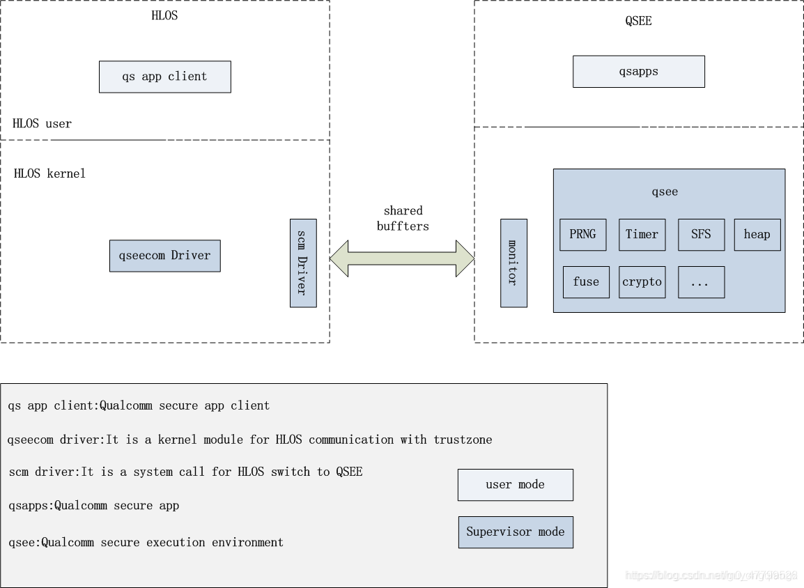 从trust zone之我见知道,支持trustzone的芯片会跑在两个世界. 普通世界.安全世界,对应高通这边是HLOS,QSEE. 如下图: 如下是HLOS与QSEE的软件架构图 HLOS这两分为 ...