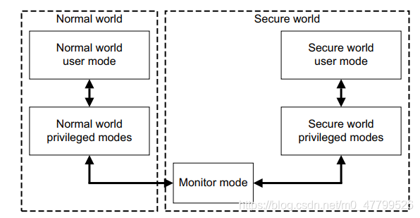基于TrustZone的系统有三种状态,安全世界、非安全世界和用于二者切换的Monitor Mode。