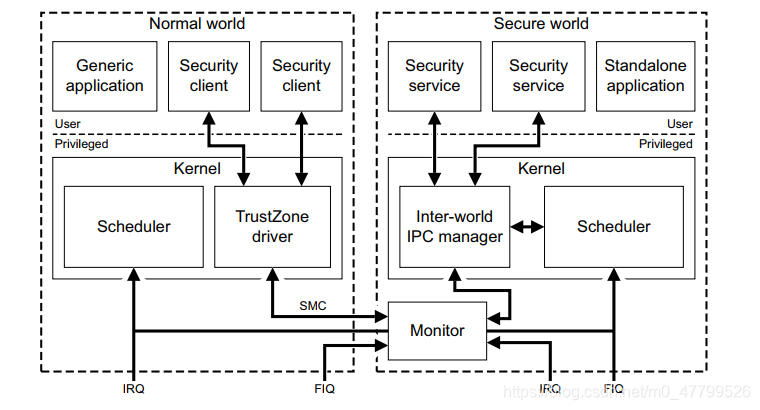 默认情况下,IRQ和FIQ异常发生后系统直接进入Monitor模式,由于IRQ是绝大多数环境下最常见的中断源,因此ARM建议配置IRQ作为非安全世界的中断源,FIQ作为安全世界的中断源。这样配置有两个优点: