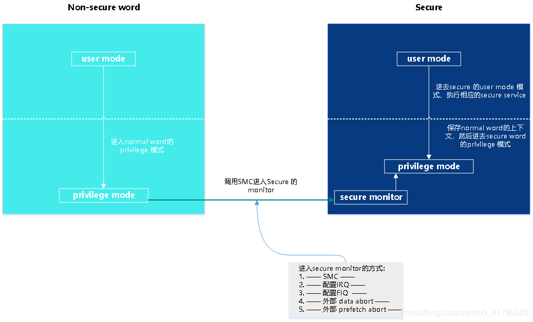 非安全世界无权访问CP15的SCR寄存器,所以无法通过设置NS来直接切换到安全世界,只能先转换到Monitor Mode,再到安全世界。