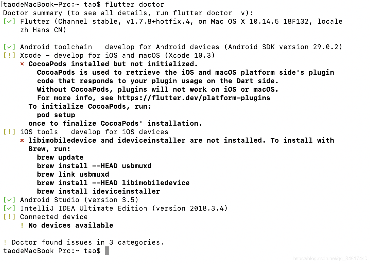 如图 显示 ✗ CocoaPods installed but not initialized. 其实最开始提示的是 ✗ CocoaPods not installed.