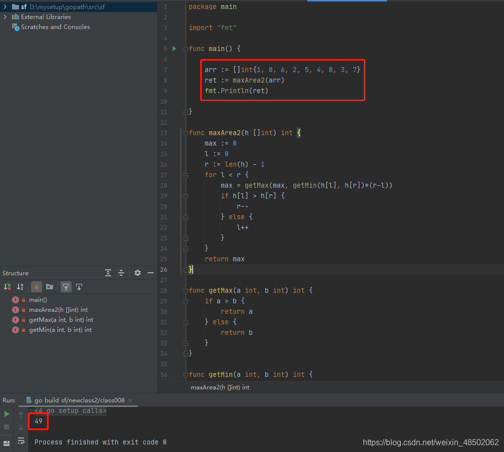 arr := []int{1, 8, 6, 2, 5, 4, 8, 3, 7}