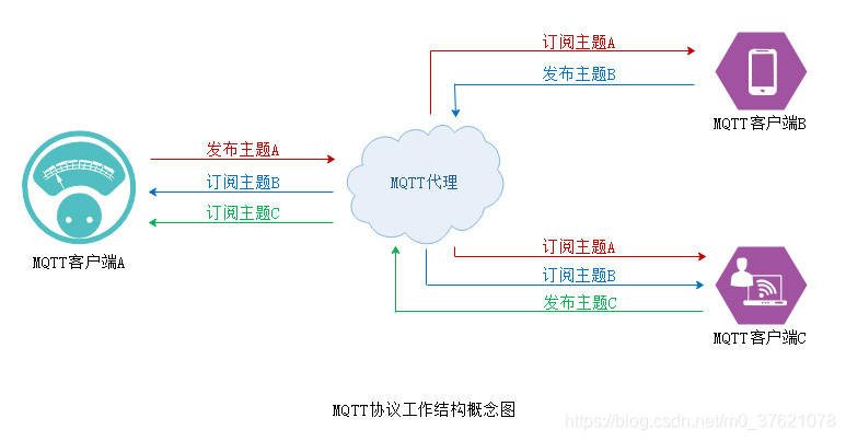 我们可以借鉴这个思路,为消息的订阅者Subscriber 和发布者Publisher 增设一个专门用来处理转发消息的代理者Broker,这就实现了订阅者和发布者的完全解耦,可以胜任比较复杂的物联网通信场景。目前比较流行的,采用订阅发布模型的物联网通信协议是MQTT,该协议的通信模型如下: