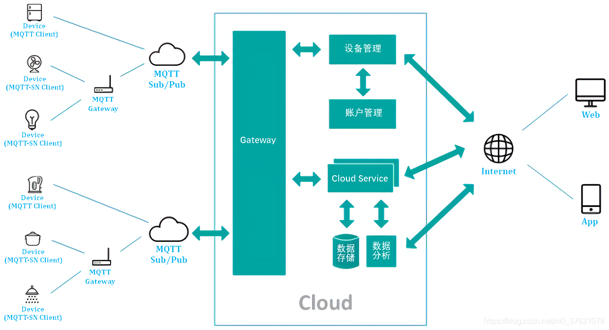 物联网设备的规模比先前移动互联网设备的规模大得多,各大互联网公司都为物联网设备的接入、管理、消息分发、数据分析等提供了相应的云服务平台(比如国内的阿里云、百度云、中国移动OneNET 等),借助IoT Cloud 和MQTT 管理物联网设备间消息传递分发的模型如下: