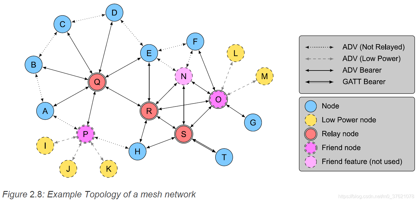 - MESH 组网:BLE MESH 组成的网络虽然有中继节点Relay node 转发消息,但各节点的地位差不多,构成的是网状网络,并没有性能强大的中心节点。