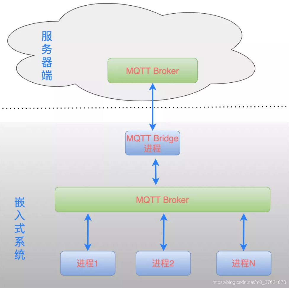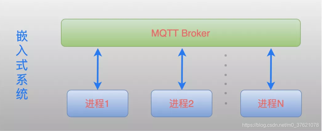 在嵌入式系统内运行一个MQTT Broker 服务进程,其它需要相互传递消息的进程都只需要跟MQTT Broker 进程通信就可以了,MQTT Broker 起到了消息总线的作用,负责各进程间消息的传递分发。比如进程1 订阅主题topic1,进程2 订阅主题topic2,如果进程2 想向进程1 发送消息,只需要将消息发布到主题topic1(消息附上发布主题topic1 后发送给消息总线进程MQTT Broker),MQTT Broker 接收到该消息并将其传递给订阅该主题topic1 的进程1。