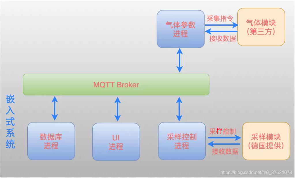 举个例子,假如需要开发一个采集大气中PM2.5、PM10 等污染物参数的环境监测系统,需要实现数据记录、UI 监控界面等功能。大气污染物数据采样硬件模块是第三方提供的,我们只需要通过该模块提供的串口协议去控制采样设备、接收采样数据即可。我们创建采样控制进程负责与采样模块的交互,UI 监控和数据记录设计成独立的进程,降低系统的复杂性,通信模型如下: