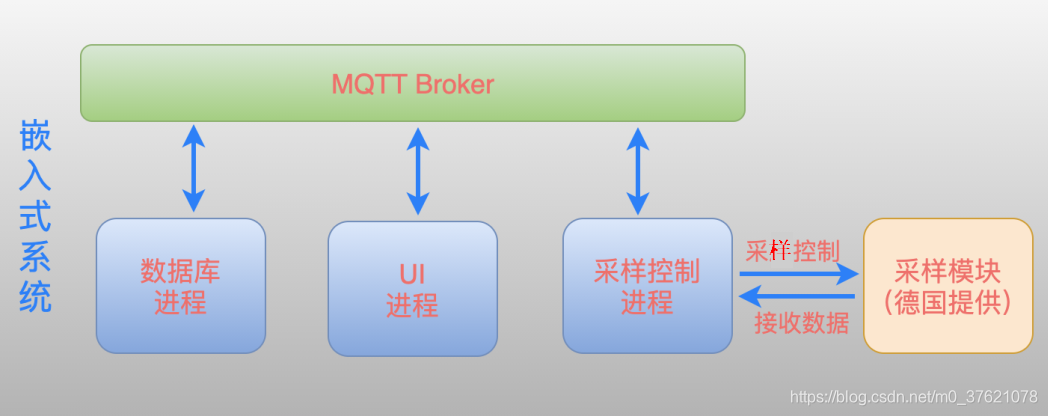 需要向外发送消息的进程都需要设定发布主题topic,比如采样控制进程发布主题topic_PM、UI 进程发布主题topic_UI,数据库进程和UI 进程都需要接收采样数据,只需要向MQTT Broker 进程订阅主题topic_PM 即可,UI 进程需要向采样控制进程发送指令数据,只需要让采样控制进程向MQTT Broker 进程订阅主题topic_UI 即可,UI 进程向主题topic_UI 发布指令消息,采用控制进程由于订阅了主题topic_UI 就可以顺利接收到该指令消息。