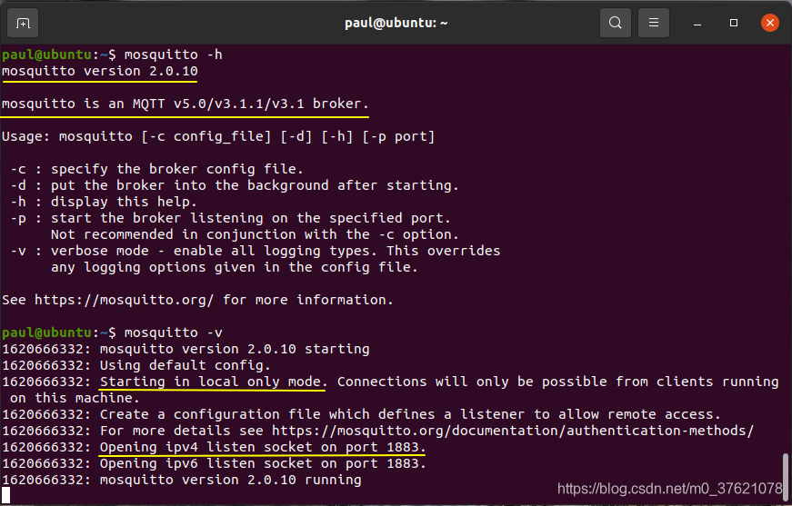 Mosquitto 可以在本机上启动一个MQTT Broker 服务,然后通过 mosquitto_sub 和mosquitto_pub 命令订阅发布主题topic 消息,此时MQTT Broker 和MQTT Client 都在本地主机上运行,通过回环接口loopback 通信(前面介绍的嵌入式系统内MQTT Broker 作为消息总线,以发布-订阅方式在多进程间传递分发消息也是使用loopback 回环接口)。命令mosquitto_sub 和mosquitto_pub 也可以连接远程的MQTT Broker,比如test.mosquitto.org(其它公共broker 可参阅public_brokers)。在本地主机启动一个MQTT Broker 服务的命令如下: