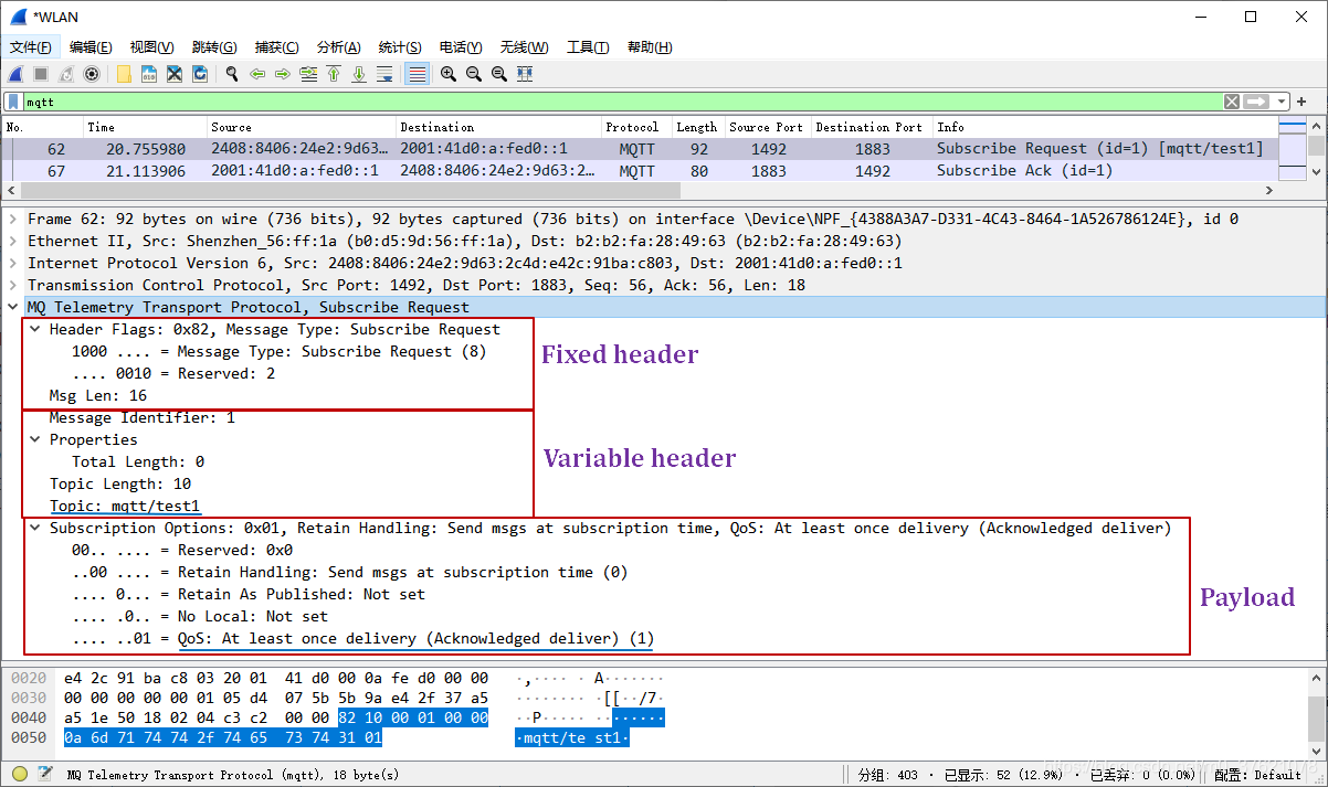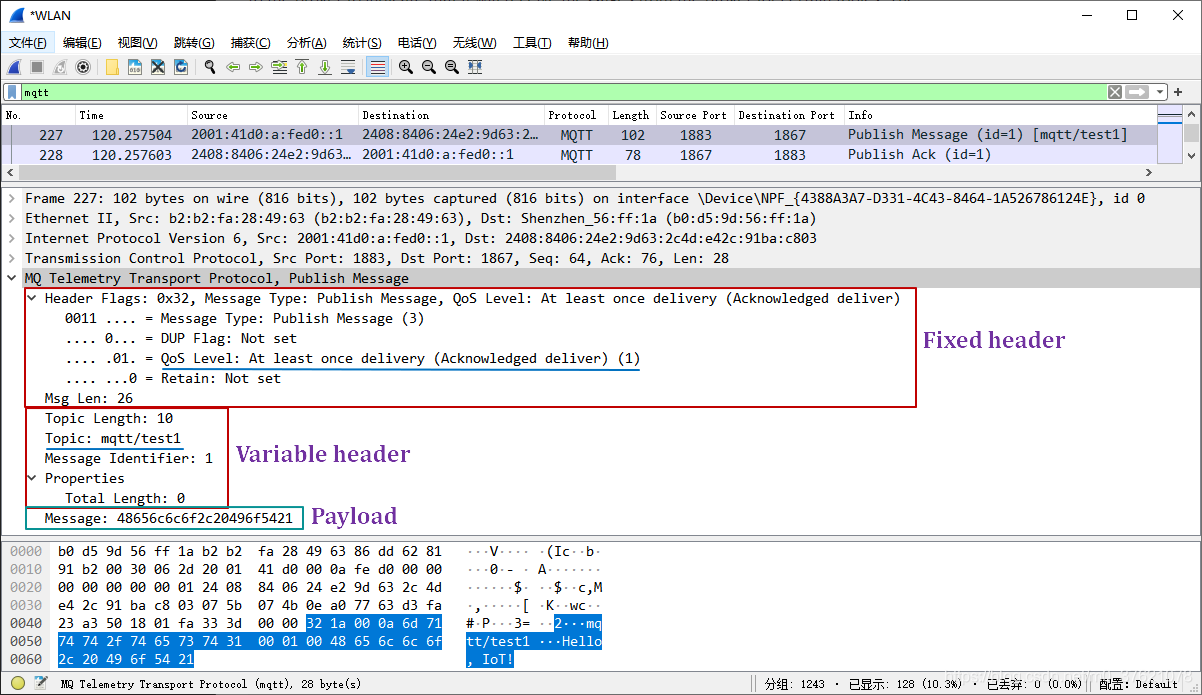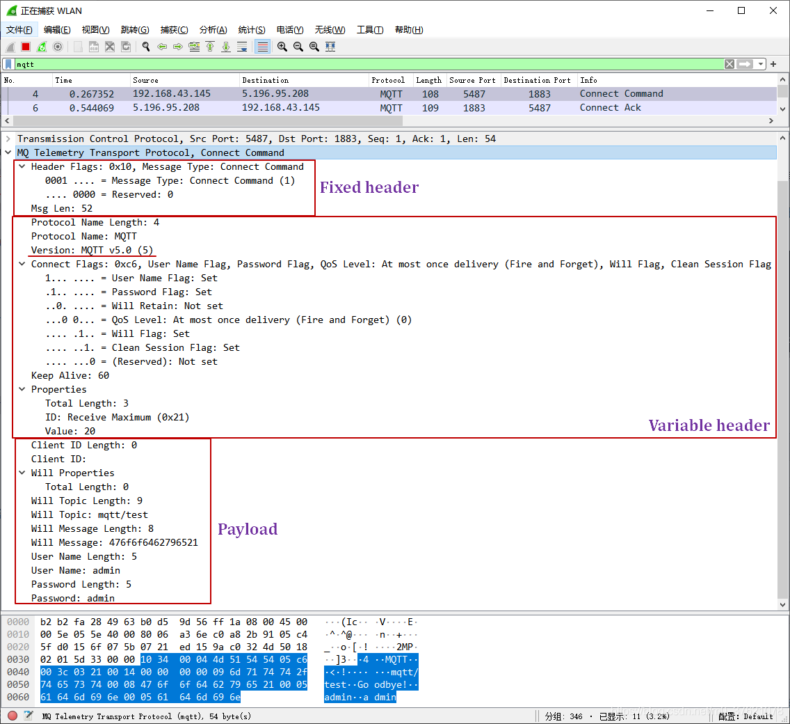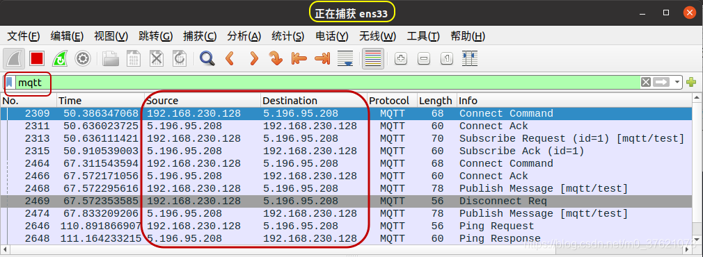 使用Wireshark 抓取的MQTT 报文源地址和目的地址显示(记得切换捕获网卡设备),确实是连接了远程MQTT Broker: