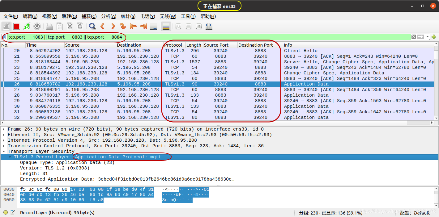 使用Wireshark 抓取的MQTTS 报文显示,确实是TLS 报文,端口号为8883,TLS 报文显示其应用层协议为MQTT: