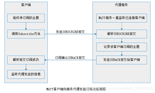 MQTT 传递消息是基于订阅-发布模型的,Client 与Broker 建立连接后,如果想接收消息,需要先订阅自己感兴趣的主题topic,一个Client 可以订阅多个主题topic。MQTT Client 如果想对外发布消息,消息都需要指定主题topic,Broker 需要通过topic 确定要将该消息分发给哪些Client(MQTT Broker 为每个topic 维护一个订阅者列表)。MQTT Client 向Broker 订阅感兴趣主题topic 的过程如下: