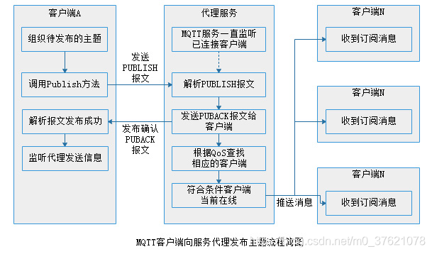 MQTT Client 订阅感兴趣的主题后,如果其它Client 在该topic 上发布消息时,Broker 就可以将该主题上的消息转发给它的订阅者。MQTT Client 在指定主题上发布消息的过程如下: