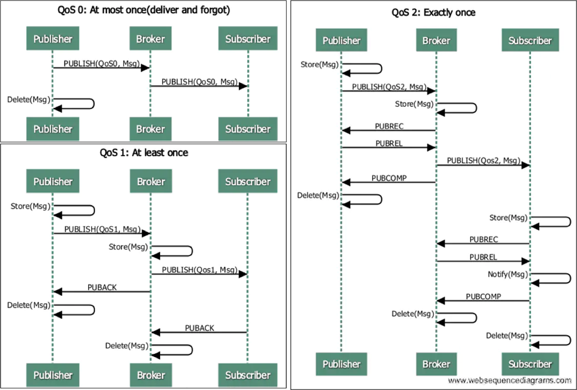 某个主题的消息从Publisher 经Broker 到Subscribers,采用不同的消息QoS 服务等级,传递消息的报文交互也不同,MQTT 支持的三种QoS 服务等级下,报文的交互过程对比如下: