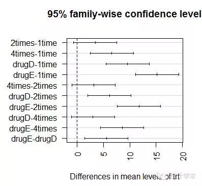 TukeyHSD()函数提供了对各组均值差异的成对检验。但要注意TukeyHSD()函数与HH包存在兼容性问题:若载入HH包,TukeyHSD()函数将会失效。使用detach("package::HH")将它从搜寻路径中删除,然后再调用TukeyHSD()
