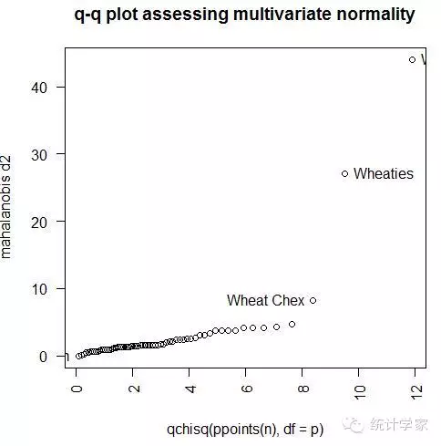 马氏距离平方值。如果点全部落在斜率为1、截距项为0的直线上,则表明数据服从多元正态