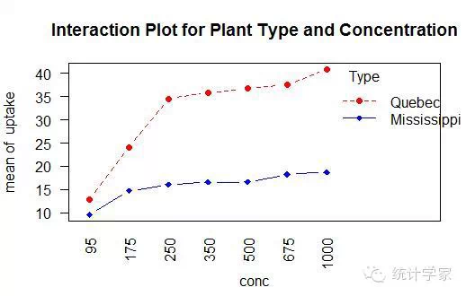 with(w1b1,interaction.plot(conc,Type,uptake,type="b",col=c("red","blue"),pch=c(16,18),main="InteractionPlot for Plant Type and Concentration"))