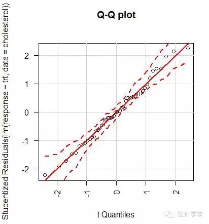 > qqPlot(lm(response~trt,data=cholesterol),simulate=TRUE,main="Q-Qplot",labels=FALSE)
