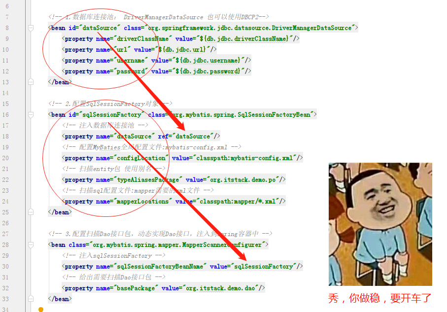 - MapperScannerConfigurer {扫描包下接口类,免去配置。这样是上图中核心配置类}