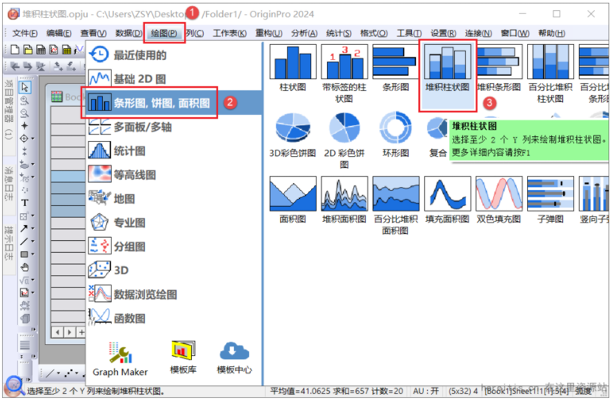 3、点击菜单栏中【绘图】→【条形图,饼图,面积图】→【堆积柱状图】: