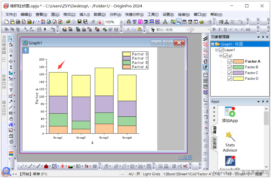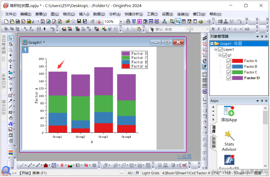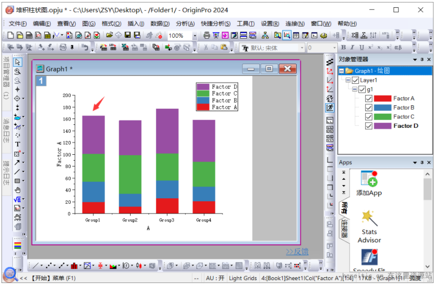 Origin2024中绘制堆积柱状图,直观展现各个指标数据!
