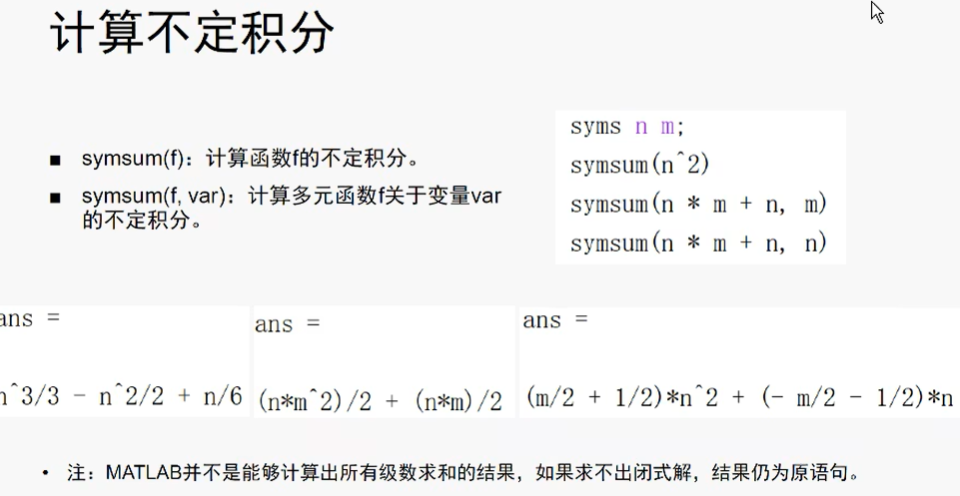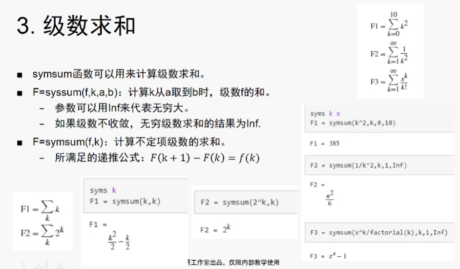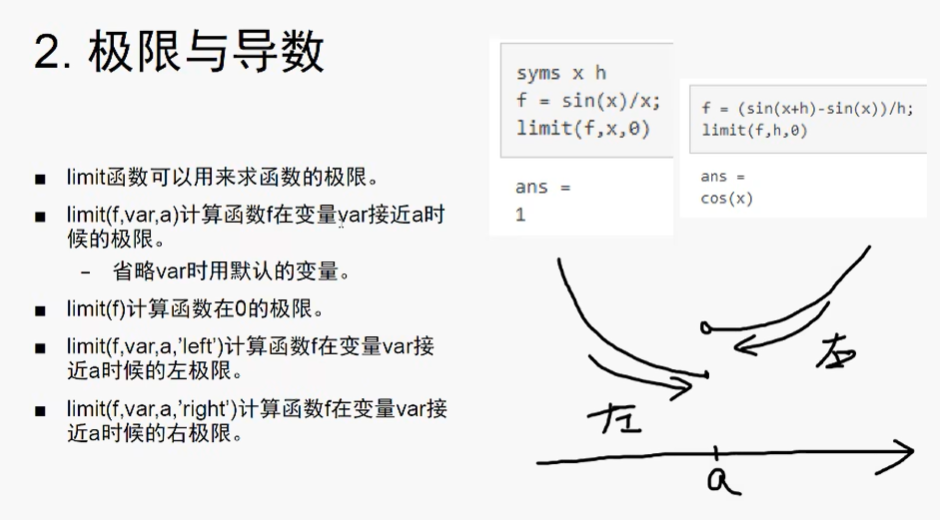 一.符号表达式的极限 limit(F,x,a):求当时,符号表达式F的极限. limit(F,a):符号表达式F采用默认自变量(可由函数findsym求得),该函数求F的自变量趋于a时的极限值. li ...