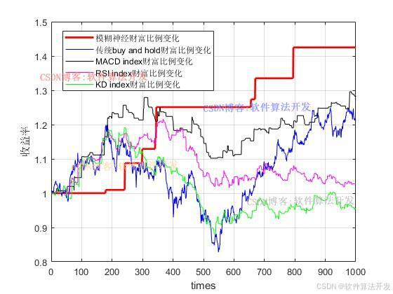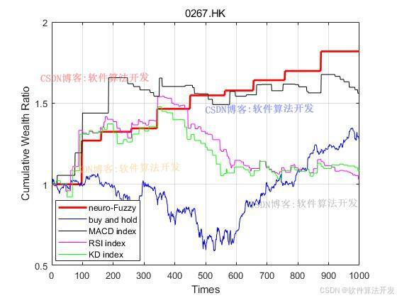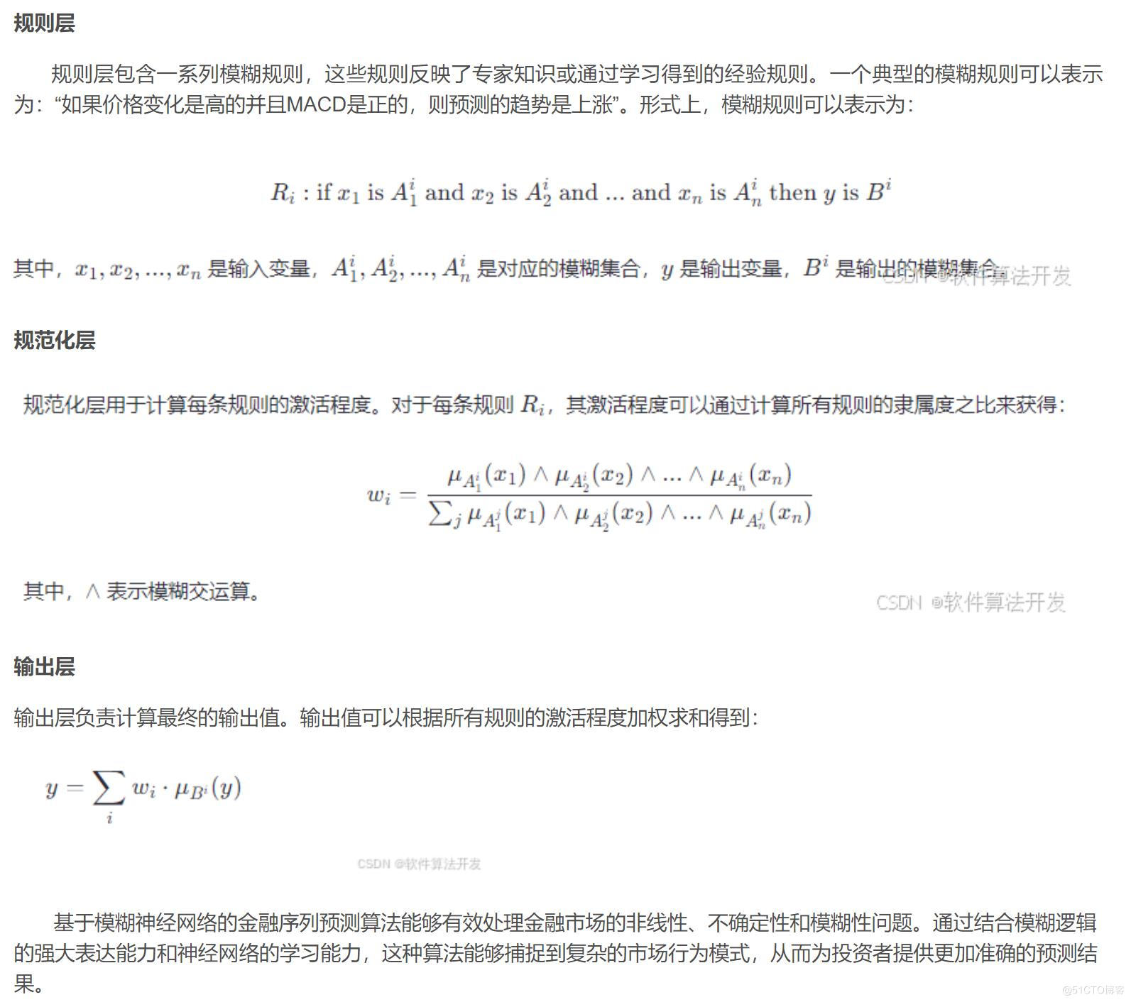 基于模糊神经网络的金融序列预测算法是一种结合了模糊逻辑和神经网络技术的先进预测方法,它适用于处理非线性、不确定性和模糊性的金融数据预测任务。在金融序列预测中,常用的指标如移动平均收敛发散指标(MACD)、相对强弱指数(RSI)以及随机指标(KD)等,可以作为输入特征用于预测股票价格或其他金融序列的变化趋势。金融序列预测旨在利用历史数据预测未来市场走势,这对于投资者制定交易策略至关重要。传统的预测方法往往难以捕捉金融市场中的非线性关系和不确定性,而模糊神经网络因其独特的非线性映射能力和模糊逻辑处理能力,在处理这类问题上显示出优势。