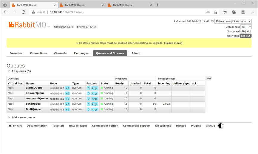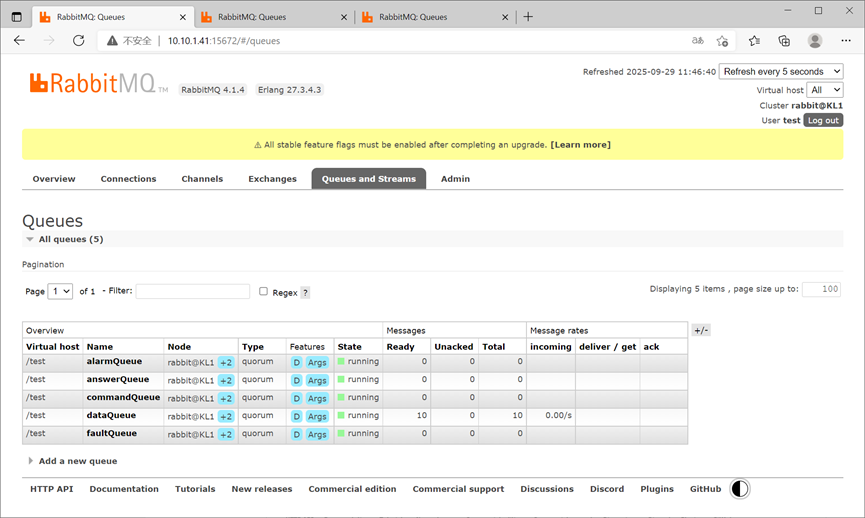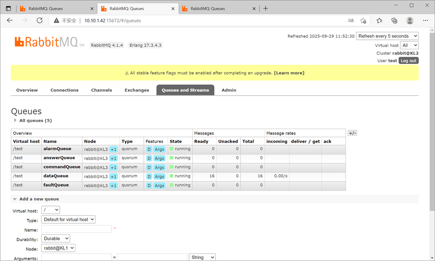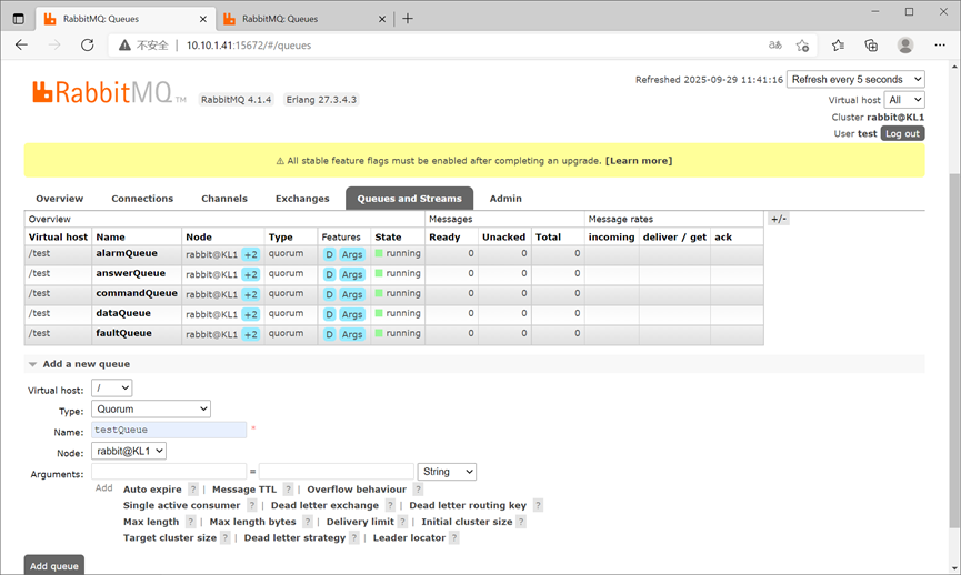 使用浏览器打开主机的配置页面,创建需要的交换机和消息队列等,在创建消息队列时选择quorum类型。