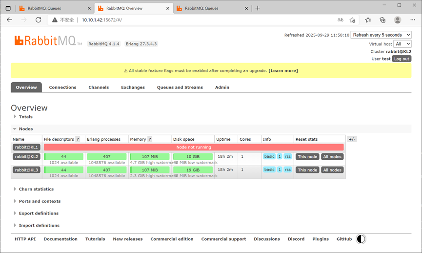 2025-09-29 15:04:55.798338+08:00 [info] <0.491.0> rabbit on node rabbit@KL1 up
