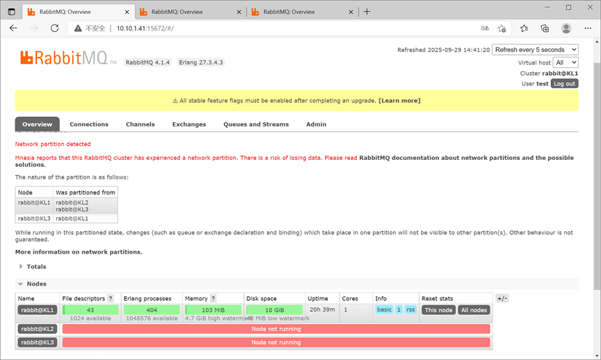 2025-09-29 11:48:34.481448+08:00 [info] <0.1310.0> rabbit on node rabbit@KL1 down