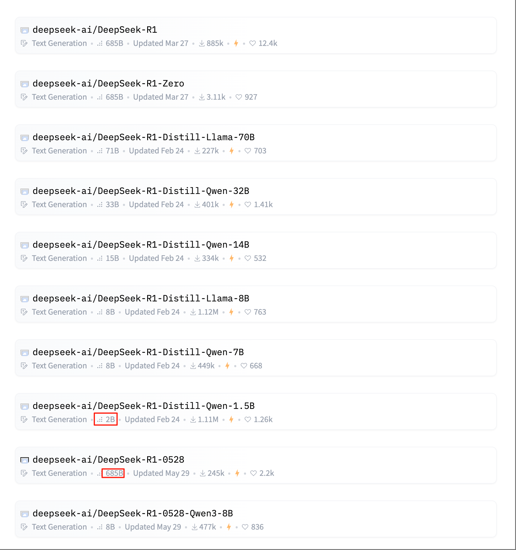 现在的那些大模型基本都是以B为单位,比如DeepSeek R1最小的是2B,最大的是685B。这里的B是指Billion,也就是10亿。2B的意思是20亿个参数,685B的意思是6850亿个参数。