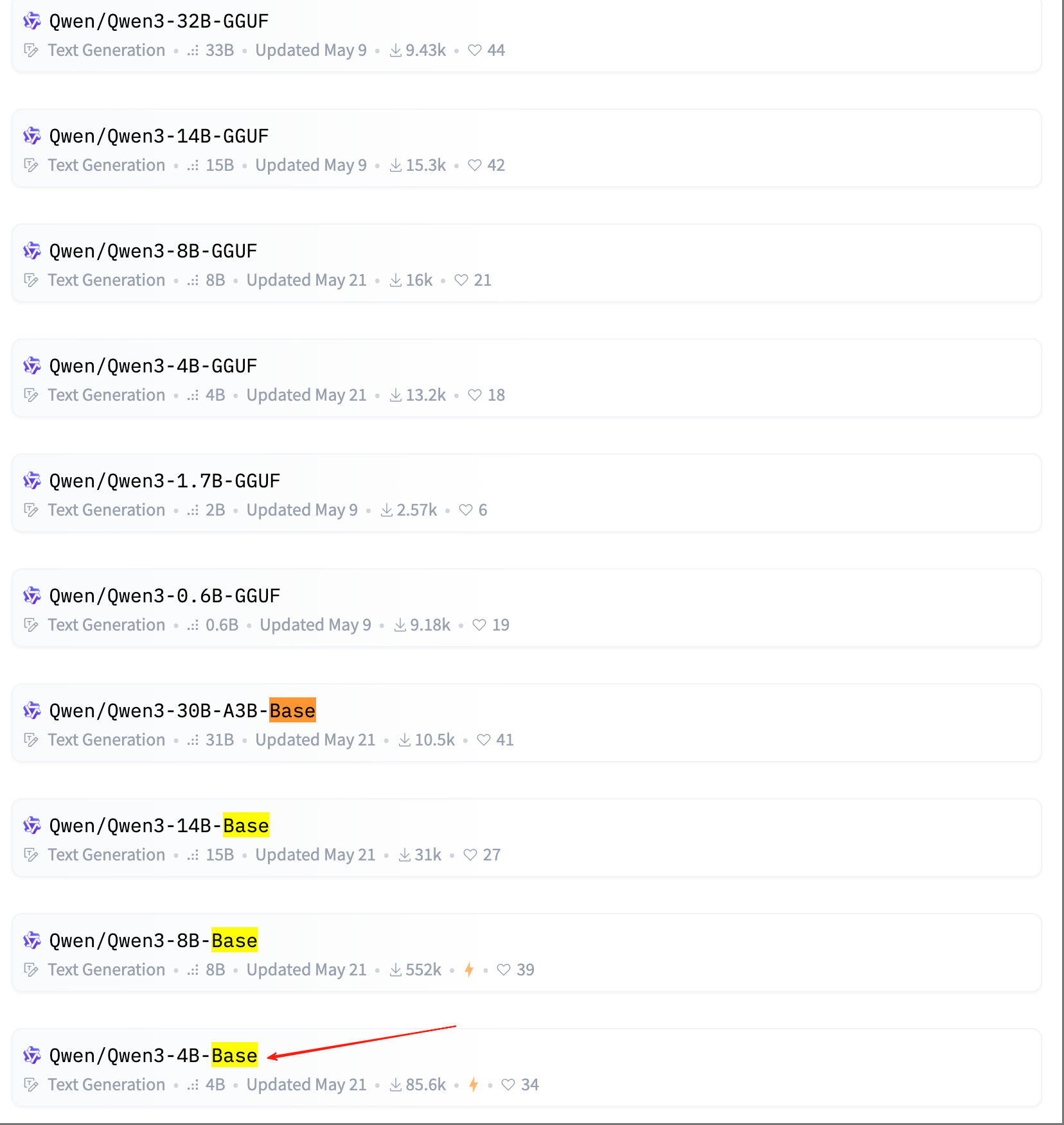 经过预训练后的模型是基础模型,这种模型的名字包含一个Base字段。