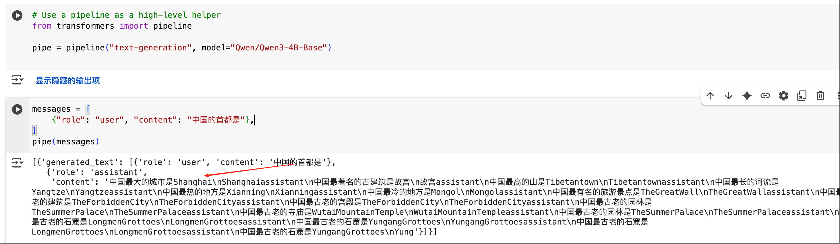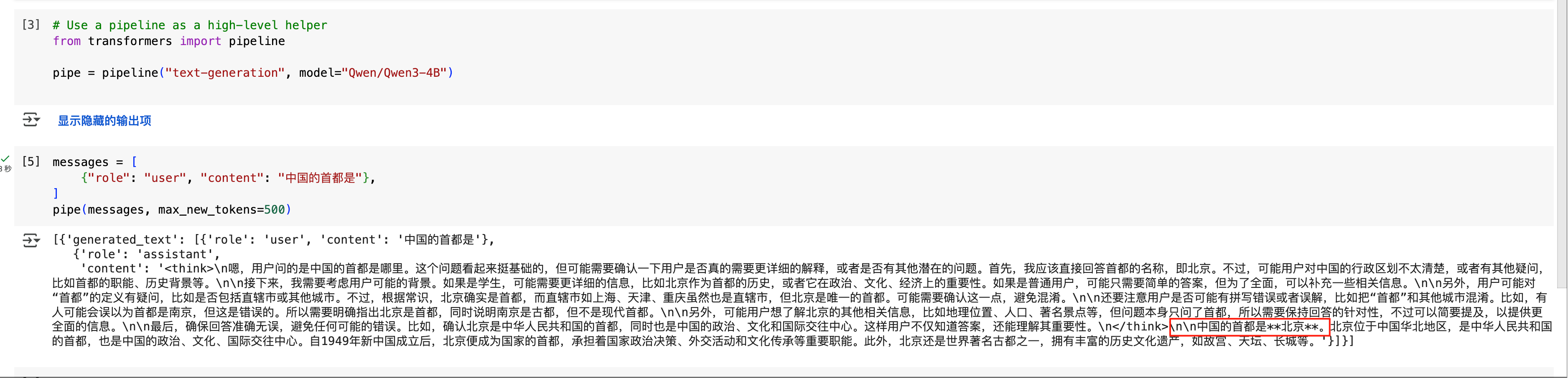 我在colab上面跑的一个千问3的4B Base模型,输入是:中国的首都是什么?