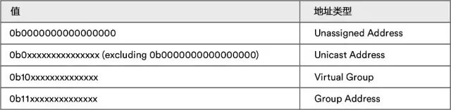 地址有四种类型,其中的三类用于消息的传送:单播(unicast)、虚拟(virtual)和群组(group)地址。第四种被称为未分配(unassigned)地址。地址长度为16位,并按下述定义进行编码(图2)。
