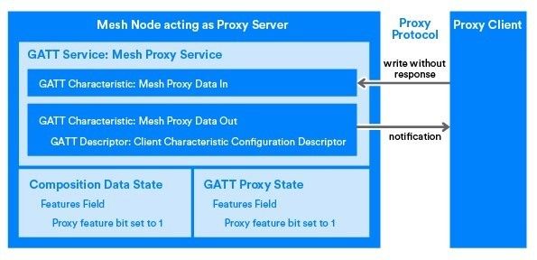 代理节点能够实现GATT和蓝牙mesh节点之间的mesh消息发送与接收。承担这一角色的节点需要固定的电源和计算资源。