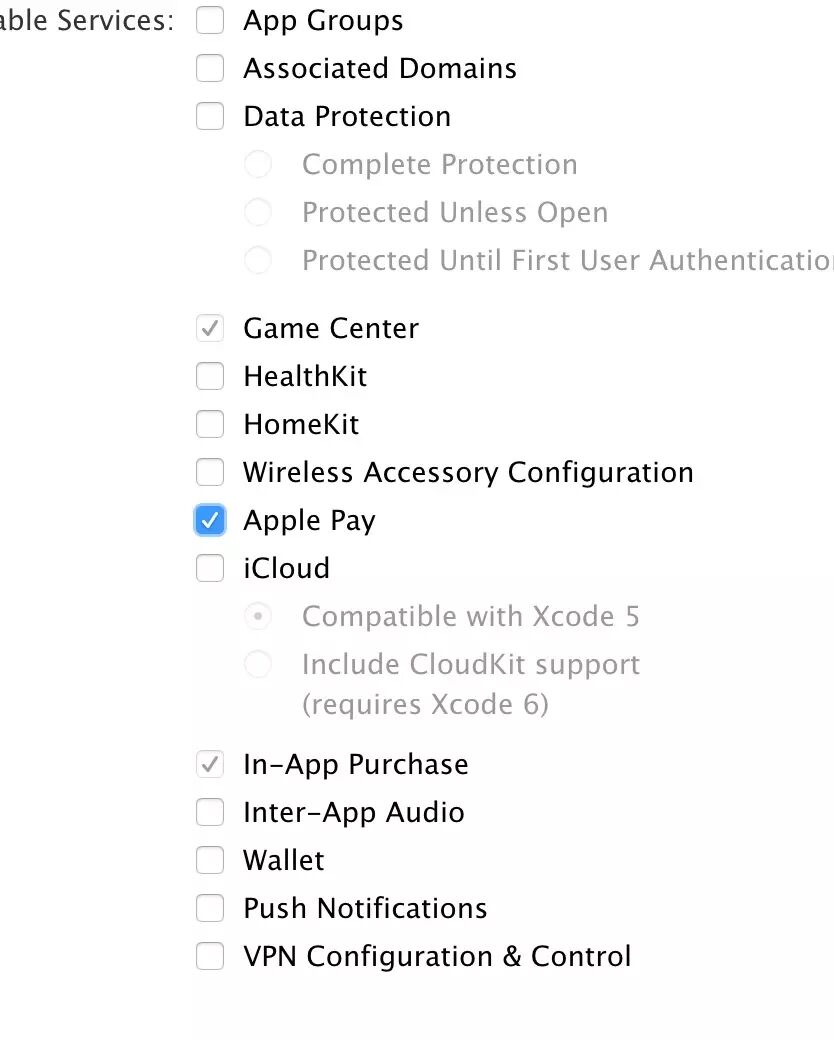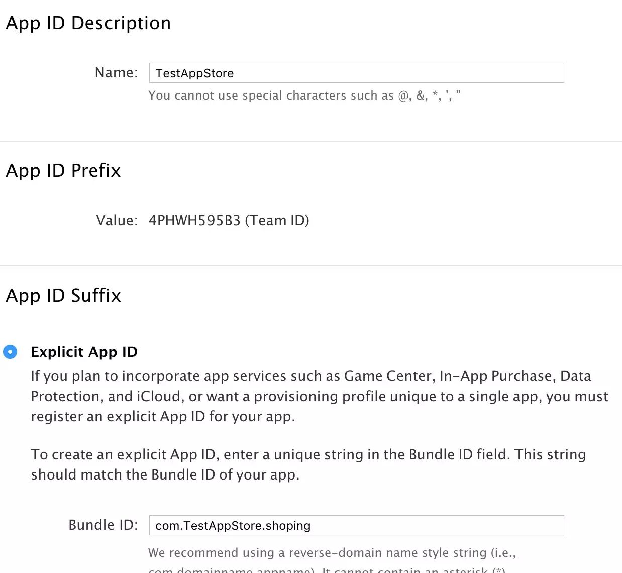 在这里Name可以随意填写,我填写的是TestAppStroeTestDemo,而用来使用的BundleID,我们在这里必须选择第一个选项唯一的,不用选择通配。在下面的选项中, 我们只需要勾选一个 Apple Pay即可,其他选项看自己需求,我在这里只选择了它。