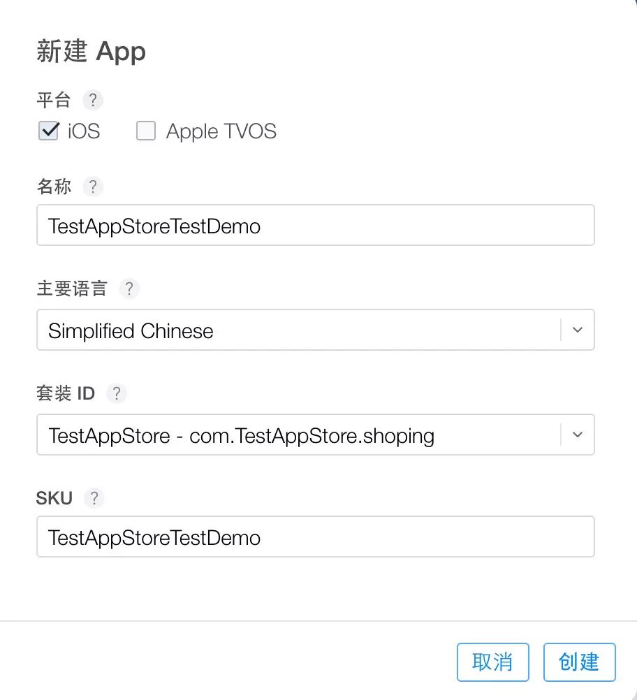 之后我们回到创建App,选择好自己刚创建的 BundleID ,填写SKU, SKU是你App的专用ID,我在这里随意填写,直接复制了App名。点击创建,我们的测试App则创建成功。