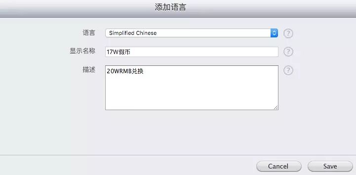 点击添加语言,填写名称和描述,这里我们依然选择简体中文,如下