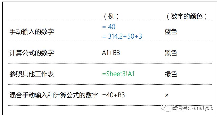 在Excel中使用的数字,分成3种:第一种是在单元格里输入(手动输入)的数字;第二种是公式计算出来的数字;第三种是参照其他工作表而来的数字。这三种数字需要用不同的颜色加以区别,使得任何人能够一目了然。